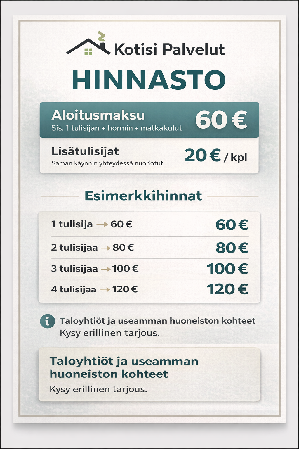 Lisätiedot: Hinnat sisältävät nuohoustyön ja hormin puhdistuksen.